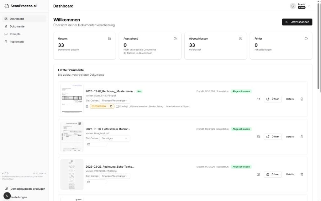 ScanProcess-ai selbst ist kostenlos nutzbar. Es fallen lediglich Kosten für die verwendete KI-API an — Stand März 2026 typischerweise wenige Cent pro Dokument. Der Verbrauch wird im Dashboard transparent angezeigt.