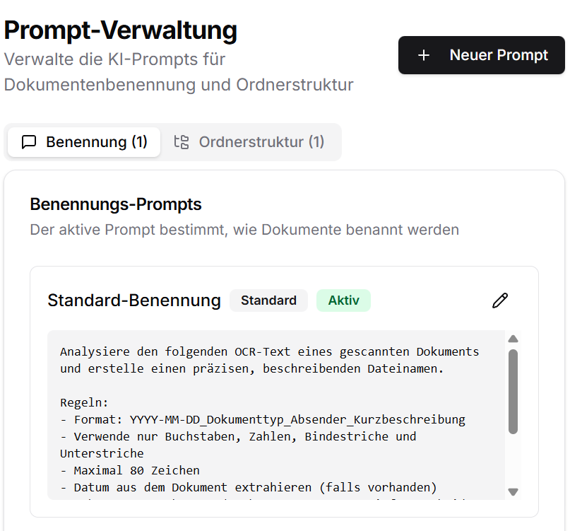 Benennung und Ordnerstruktur per KI-Prompt — Standard nutzen oder eigene Regeln definieren.
