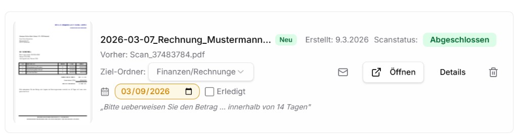 Pro Dokument: KI-Name, Zielordner, Fälligkeit, Erledigt-Markierung. Aktionen: E-Mail, Öffnen, Details.