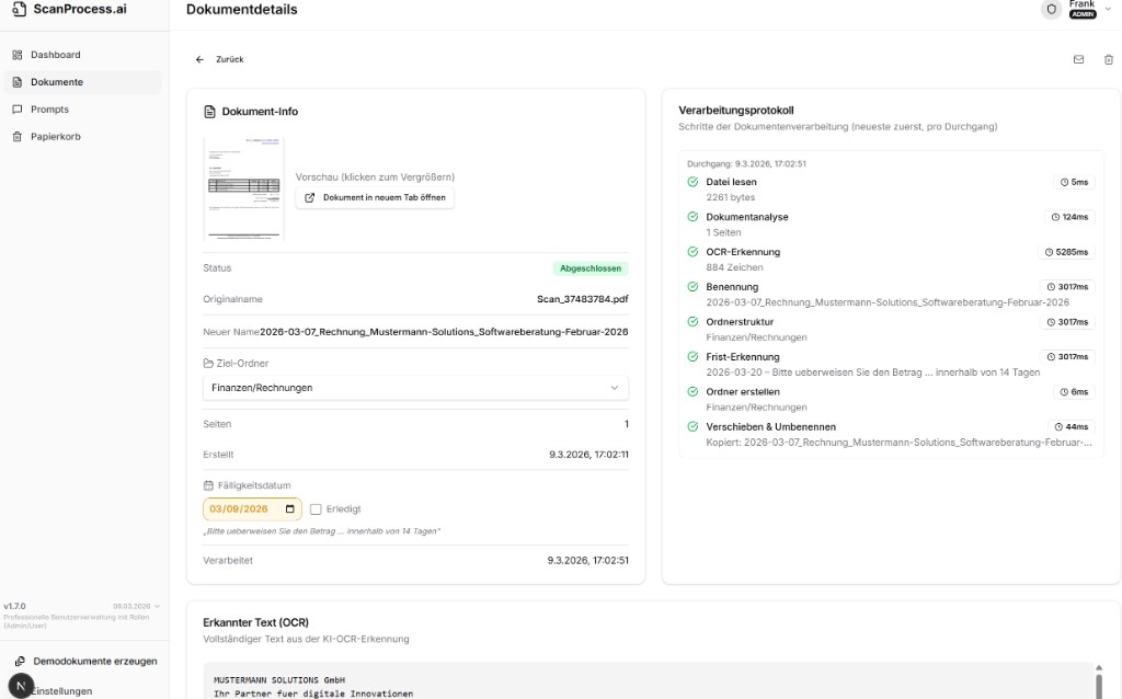 Vollständiges Verarbeitungsprotokoll und erkannter OCR-Text pro Dokument.